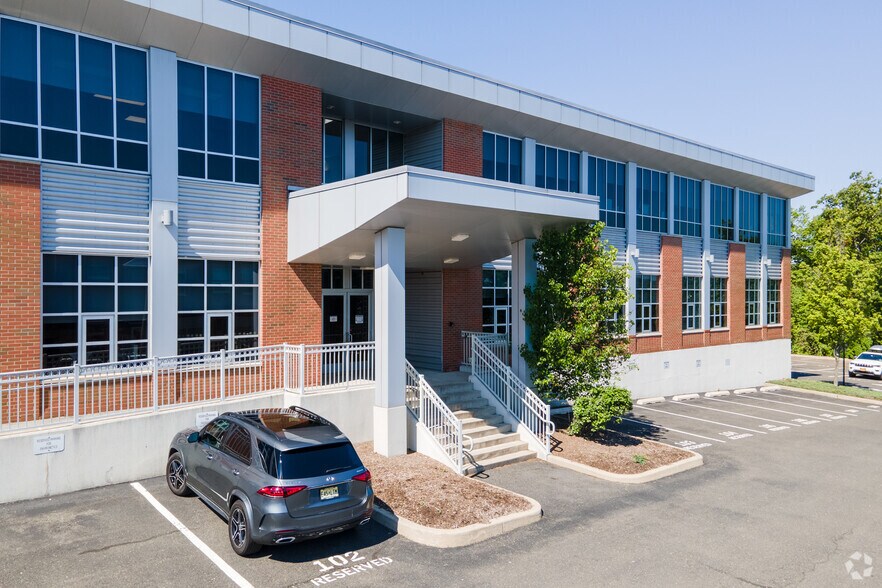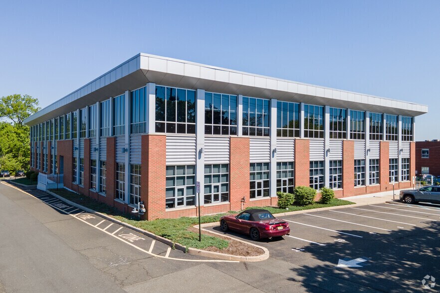 Two story office building with elevator, abundant windows, and high ceilings located on Sylvan Ave. (known as the “Trillion Dollar Mile”) in Englewood Cliffs, NJ. Dramatic bright atrium lobby with granite floors. Abundant on-site parking. (4 cars/1000 sq. ft.)