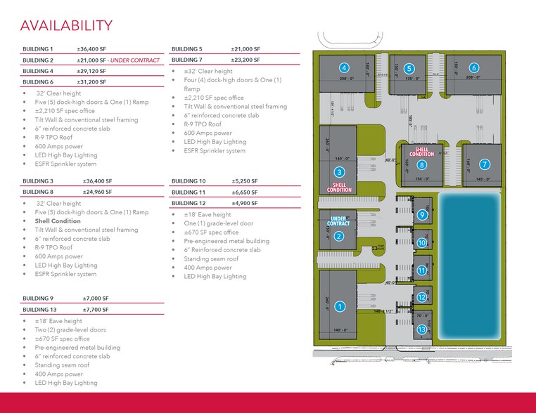• ±18’ Eave height • One (1) grade-level door • ±670 SF spec office • Pre-engineered metal building • 6” Reinforced concrete slab • Standing seam roof • 400 Amps power • LED High Bay Lighting