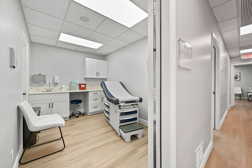 Available October 2025 1,530 sqfeet with a spacious waiting room, 2 private offices, Reception, 2 Bathrooms, 4 exam rooms and a kitchen/break room. Hillmoor Professional is located steps away from St. Lucie Medical center and hosts a variety of medical providers along with professional offices. This unit is 1st floor in building A and includes in addition to a circular drive for drop offs, and outdoor parking there is an under building garage space with an elevator. The office is bright with and a also offers a rear exit. Building has fire suppression and ADA bathrooms. New Flooring, Paint and updates to cabinetry coming soon.