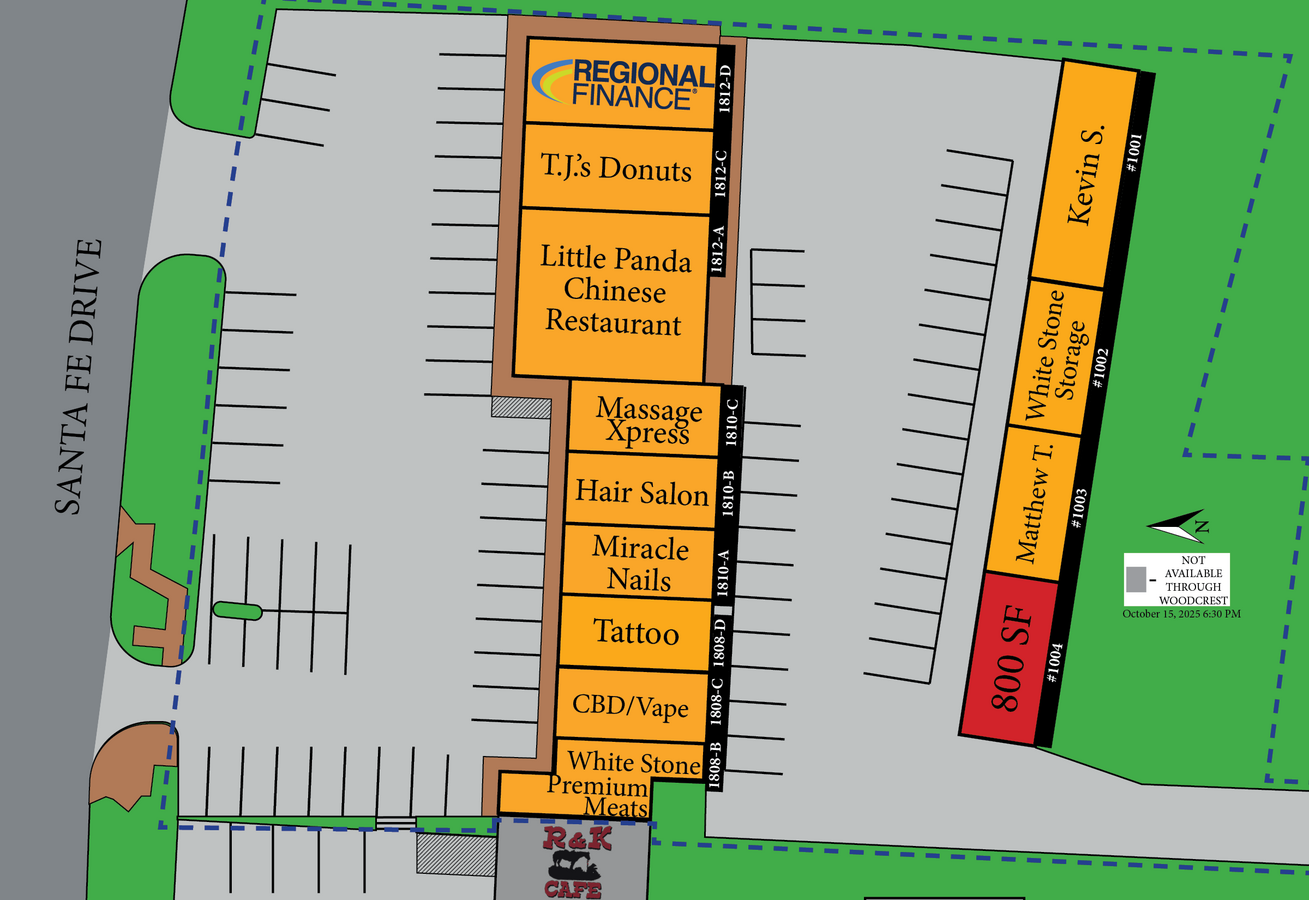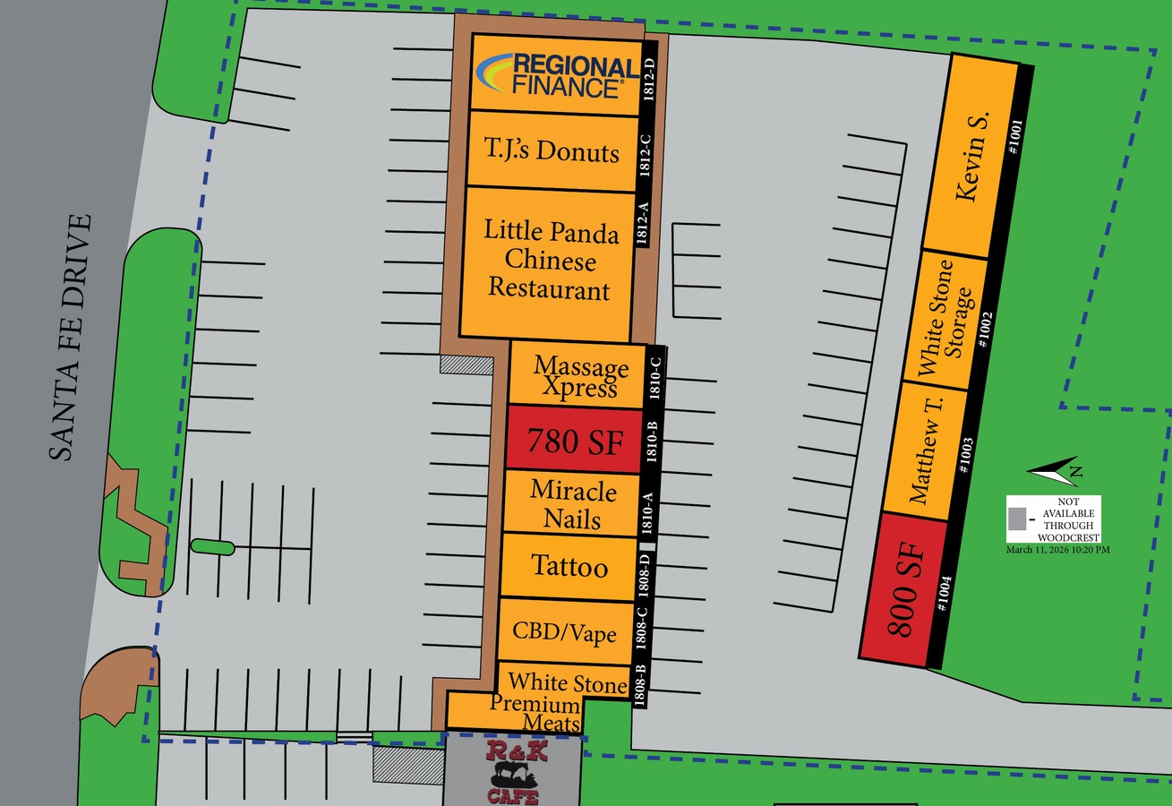 Flexible terms starting at 12 months. $600 per month for an 800 SF (2-room) space; $600 security deposit. Access to the building is from Clear Lake Road or by walking behind the Santa Fe Shopping Center on Santa Fe Drive. Suitable for various light workshop/storage/small office uses, these suites would be a perfect home-base for lawn care, e-commerce, or any sort of small startup needing a private, commercial office location that is not visited by customers nor occupied all day. THERE ARE NO RESTROOMS IN THE BUILDING Each unit has a bay door, A/C unit, and water spigot. Traditional retail storefronts and larger office spaces are also available nearby, sometimes also including at the Santa Fe Shopping Center in front of these flex spaces.