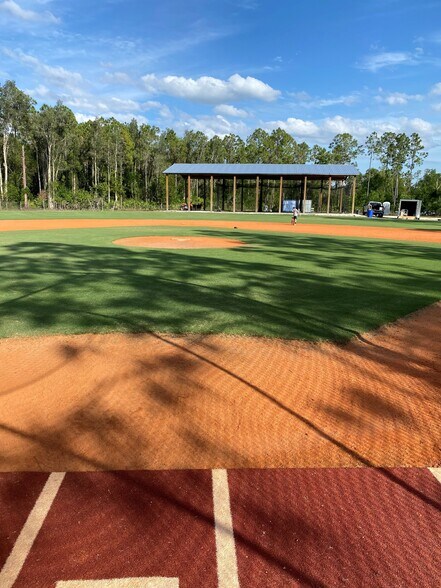 5 acres disponibles à la vente à Estero Actuellement utilisé pour l'entraînement au baseball Auvent de 3 200 pieds carrés (40 pi x 80 pi) avec configuration d'éclairage pour cages à frappeurs Terrain de baseball