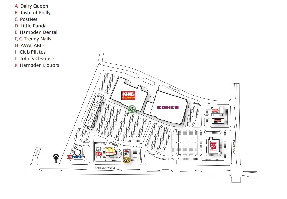The Shops at Hampden Crossing offers exceptional retail opportunities in one of Aurora's most established and high-traffic shopping destinations. Strategically positioned on East Hampden Avenue, this well-maintained retail center provides tenants with outstanding visibility, strong co-tenancy, and access to a thriving demographic market. Property Features *High-visibility monument and pylon signage opportunities *Ample parking with convenient access *Well-maintained common areas and landscaping *Established customer base with multiple shopping destinations *Mix of retail, restaurant, and service uses Anchor & Co-Tenancy The center benefits from exceptional anchor tenants and a diverse retail mix: *King Soopers (Grocery Anchor) *Kohl's (Department Store Anchor) *National Credit Tenants: Walgreens, McDonald's, Dairy Queen, GNC