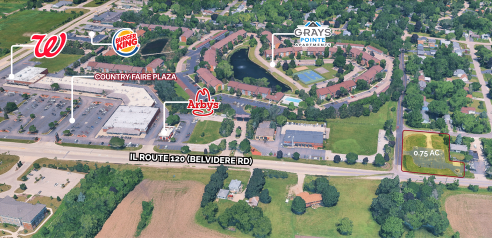 Prime corner development site located at the intersection of IL Route 120 and Sears Boulevard in Grayslake, IL. This highly visible property offers 126 feet of frontage, two full-access corners, and exposure to 23,100 vehicles per day. Zoned GB (General Business), the site is ideally suited for retail or service-oriented development. Positioned near strong national tenants including Walgreens, Jewel Osco, McDonald’s, and Arby’s, and surrounded by an affluent trade area with average household incomes over $170,000 within three miles.