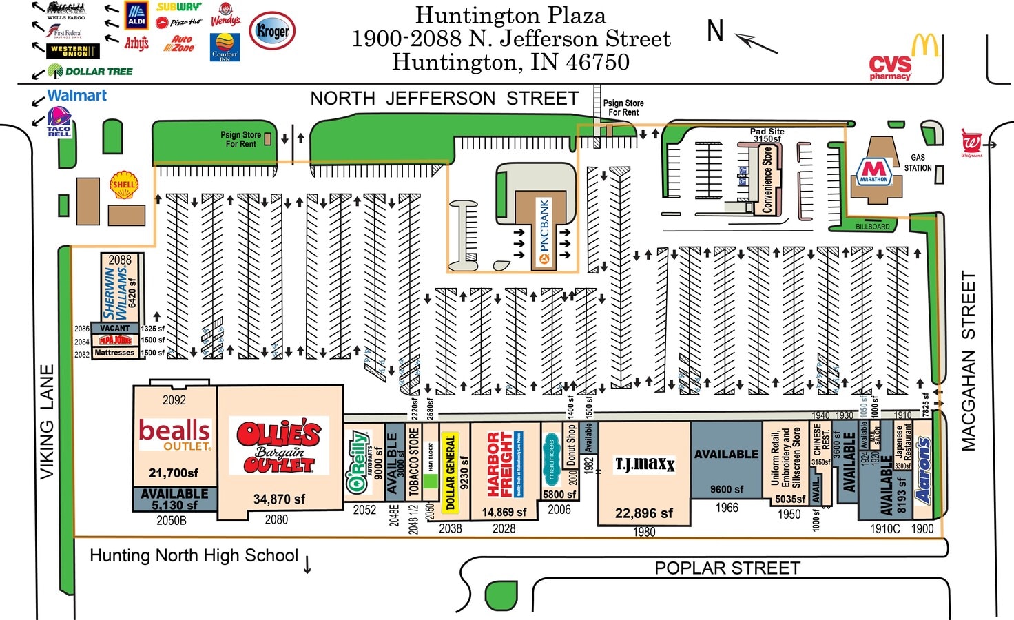 Huntington Plaza 1900-2092 N Jefferson St Espace disponible | 98–3 103 m² | Local commercial | Huntington, IN 46750