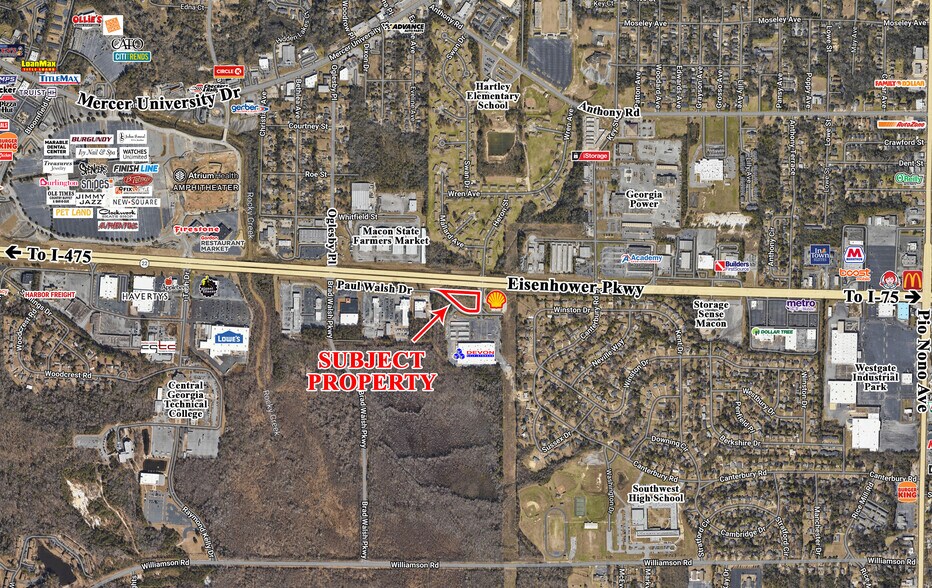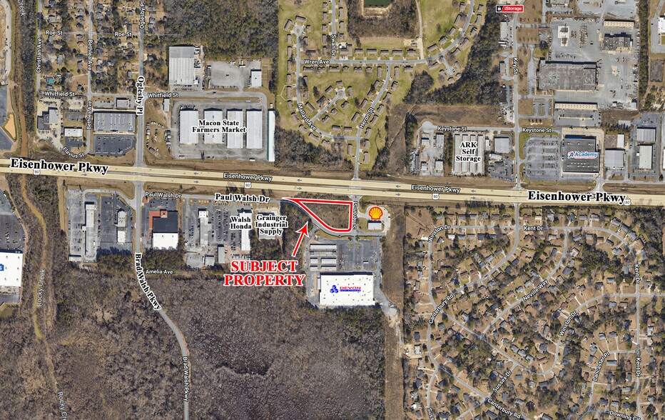 Idéalement situé sur Eisenhower Parkway (US Highway 80) entre l'I-75 et l'I-475. Les entreprises voisines incluent Devon Self Storage, ARK Self Storage, Walsh Honda, Grainger Industrial Supply, Academy Sports, Macon State Farmers Market, Lowe's, le Central Georgia Technical College, Havertys, Applebee's, Harbor Freight, Builders First Source et de nombreux autres détaillants et restaurants.