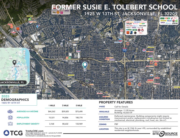 Trinity Commercial Group is pleased to present the Former Susie E. Tolbert School, an 11.99 ± acre redevelopment opportunity located at 1925 W 15th Street, Jacksonville, FL 32209. Positioned near the intersections of W 15th Street and Fairfax Street, the property offers convenient access to Kings Road, New Kings Road, and US Route 1, providing direct connectivity to downtown Jacksonville and surrounding neighborhoods.