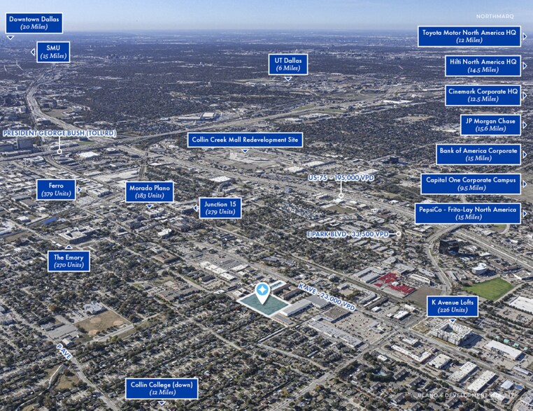 The property is strategically positioned just south of Park Boulevard, providing convenient access to major north–south and east–west thoroughfares, including US-75 (Central Expressway) and Park Boulevard. This prime location allows for efficient connectivity to Legacy West, Downtown Plano, and key employment centers throughout North Dallas, Frisco, and Richardson.