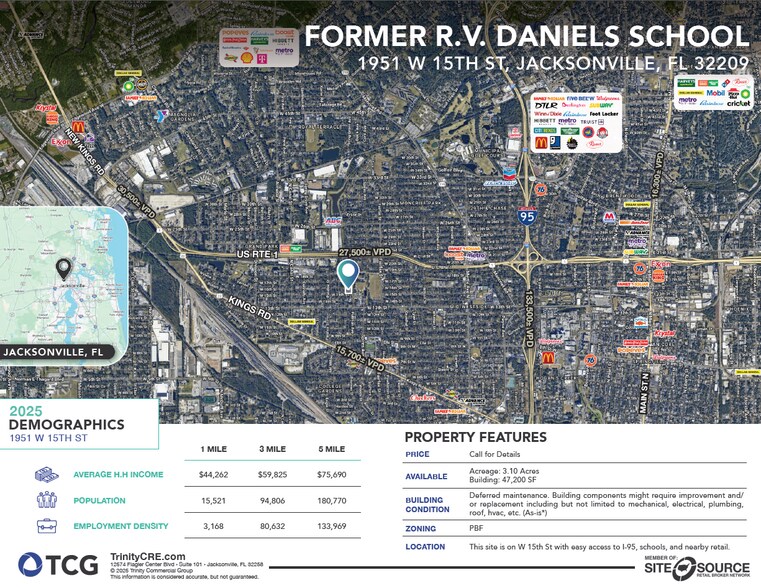 Trinity Commercial Group is pleased to present the Former R.V. Daniels School, a 3.10 ± acre redevelopment opportunity located at 1951 W 15th Street, Jacksonville, FL 32209. The property sits near Fairfax Street, W 13th Street, and Kings Road, offering convenient access to I-95, New Kings Road, and US Route 1 — key routes connecting directly to downtown Jacksonville and surrounding commercial corridors.