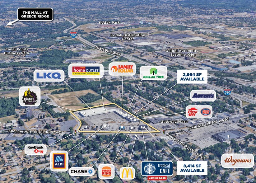 Le Gates Plaza est situé à l'intersection principale des routes Spencerport et Howard, avec un accès facile à l'Interstate 390. Il dessert une zone commerciale dense abritant plus de 400 000 habitants dans un rayon de 11 km et propose un solide mélange de magasins spécialisés, de restaurants et de magasins industriels, notamment Aldi, Planet Fitness, Family Dollar, Dollar Tree, LKQ et le restaurant de longue date Giuseppe, qui s'est agrandi deux fois depuis son ouverture. Il existe plus de 15 000 entreprises dans un rayon de 11 km, dont Kodak, Eastman Business Park et Canal Ponds Business Park, faisant de Gates Plaza un lieu idéal pour le commerce de détail et l'industrie.