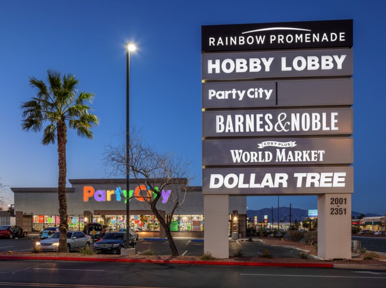 Former Party City Prime retail location in Rainbow Promenade at 2001-2351 N. Rainbow Blvd., Las Vegas, NV 89108 Dual pylon signage opportunities: one freeway-facing monument sign (189,000 CPD exposure) and one along Rainbow Blvd. ±10,500 SF of available retail space in a freestanding two-tenant outparcel building Part of established Rainbow Promenade shopping center Anchored by national retailers including: Hobby Lobby (64,795 SF),Barnes & Noble (24,900 SF),Cost Plus World Market (18,960 SF),AMC Theatre,Dollar Tree (13,000 SF)