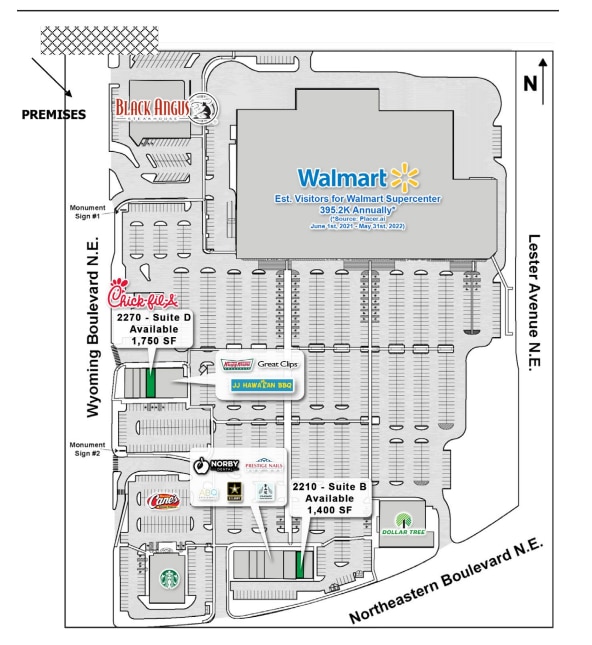 Le Wyoming Mall est un centre commercial ancré au Walmart Supercenter au cœur de Northeast Heights. Outre la forte clientèle de Walmart, le Wyoming Mall abrite le premier Raising Cane's d'Albuquerque, qui rejoint Chic-Fil-A, Krispy Kreme et Dollar Tree. On y trouve deux excellents centres de strip-tease à locataires multiples qui bénéficient de la clientèle de Walmart, qui présente de belles façades en pierre empilée, de grandes vitrines et une combinaison de locataires qui continue d'attirer le centre. L'un des bâtiments est directement exposé à la circulation sur le boulevard Wyoming et l'autre est situé en ligne. C'est une excellente occasion de rejoindre la gamme de locataires médicaux qui a débuté dans le secteur de l'orthodontie et des prothèses dentaires. Ce centre est entouré de quartiers résidentiels de longue date peuplés de familles à revenu moyen qui ont fait de Walmart un produit de base pour leurs achats. Dans un rayon de 3 miles, la densité de population est de 63 000 habitants et le revenu moyen est de 57 000 dollars. Le centre commercial Wyoming s'étend sur 28 acres sur le boulevard Wyoming, entre Indian School Rd et Menaul Blvd. Il bénéficie d'un emplacement idéal, à un kilomètre à l'est du sous-marché Uptown et à un kilomètre au nord de l'Interstate 40.