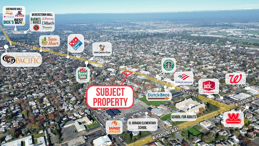 Located on Pacific Avenue within Stockton’s historic Miracle Mile retail corridor, this property sits in one of the city’s most recognizable and well-established shopping, dining, and lifestyle destinations. The site benefits from strong daily traffic, excellent visibility, and a dense surrounding residential base, while being surrounded by a mix of national and regional retailers including Starbucks, Dutch Bros, McDonald's, Walgreens, Jack in the Box, Save Mart, and numerous restaurants and retail service businesses. The property is strategically positioned between El Dorado Elementary School and Stockton Unified’s Adult School facilities to the south and the University of the Pacific just a few blocks to the north, with San Joaquin Delta College and major regional retail anchors—including Sherwood Mall and Weberstown Mall—located further north, supporting strong daytime population, education-driven traffic, and consistent consumer activity along the corridor. This highly active Miracle Mile trade area continues to support strong tenant demand and sustained retail vibrancy.