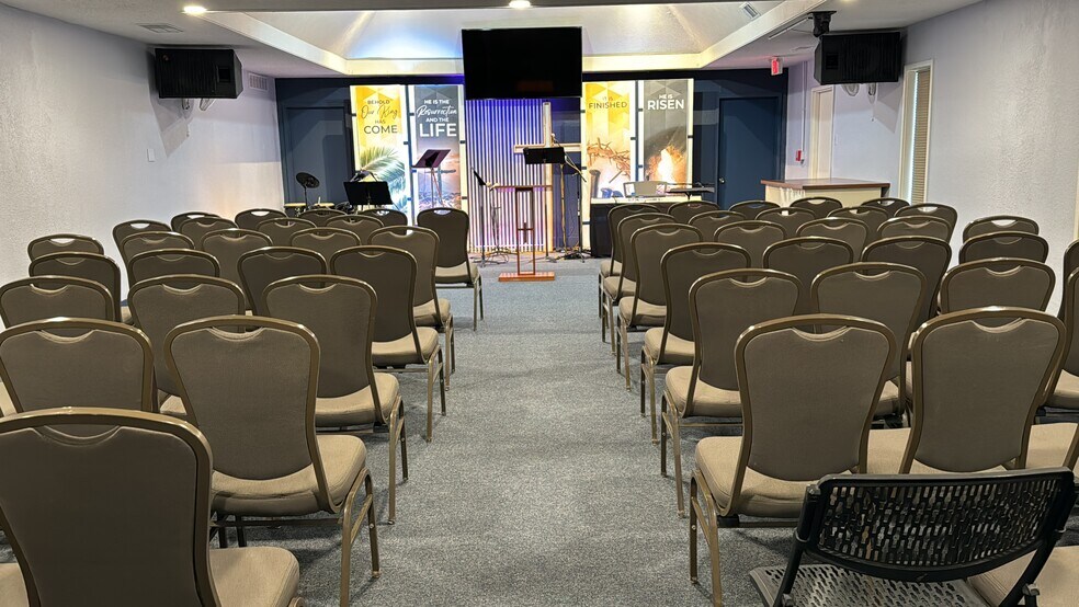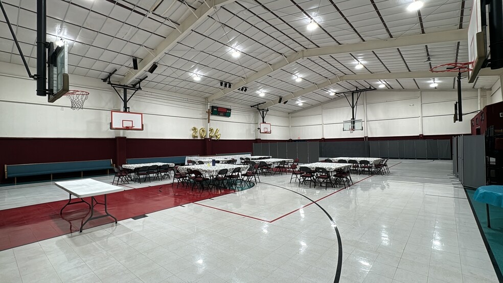 The main sanctuary provides seating for approximately 500 attendees and is complemented by multiple classrooms, meeting rooms, fellowship space, offices, and support areas that allow for flexible ministry use. A large indoor multipurpose space offers additional functionality for youth, events, or community gatherings.