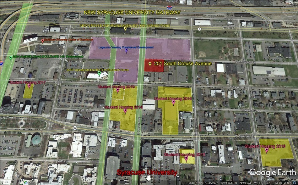 This fully entitled .58-acre development site presents a rare, shovel-ready multifamily opportunity in the heart of Syracuse’s coveted University Hill neighborhood, one of Central New York’s strongest and most resilient rental markets. All municipal approvals, permissions, and design work are in place for an 88-unit studio apartment project, allowing a developer to move directly into execution while minimizing entitlement risk, soft costs, and timeline uncertainty. Strategically positioned just off the Syracuse University campus and within the city’s primary medical district, the site sits moments from Syracuse University, Crouse Hospital, SUNY Upstate Medical University, and the VA Medical Center, together representing some of the region’s largest employers and demand drivers. This concentration of students, medical professionals, faculty, and young urban renters underpins consistently high demand for well-located, efficient housing in the immediate area. The property lies within a federally designated Opportunity Zone, offering investors potential tax-advantaged upside in addition to strong underlying real estate fundamentals. Residents will benefit from immediate access to Interstate 81 and I-690, with rapid connectivity to Downtown Syracuse, Armory Square, arts and cultural venues, dining, shopping, and essential neighborhood services, reinforcing the long-term appeal and stickiness of this location. Combining turnkey entitlements, a high-density urban design, and a walkable, amenities-rich setting, this site delivers a compelling platform for an 88-unit studio community tailored to the University Hill and mediplex tenant base. For developers and investors seeking scalable new construction in a proven rental corridor—enhanced by Opportunity Zone benefits—there are clear reasons why demand in this pocket remains so strong.