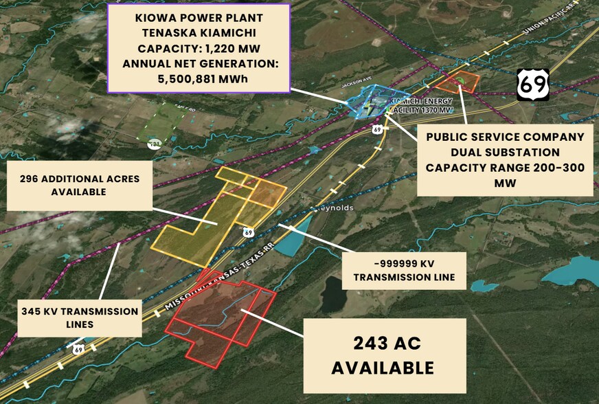 Property Description: Discover 243-acres of prime land in Atoka County, ideal for hyperscale data center development, Battery Storage, and Renewable Energy. This site is strategically located near the Kiowa Power Plant and the Public Service Company substation (dual substation), ensuring reliable and efficient energy access. Proximity to a 1,370-MW (approximate), capable of powering more than 1 million homes, natural gas-fueled, electric generating facility south of Kiowa. Any fiber-based product that may be needed can be provided (i.e. 100Gbps waves, 100Gbps DIA, 100Gbps Ethernet Private Lines). There are two fiber routes between Oklahoma network and Equinix Data Center located at 1950 Stemmons, Dallas, TX. Key Features - Size & Zoning: 243 acres of undeveloped land, zoned RA (Rural Agricultural). Power Accessibility: Proximity to two major power facilities guarantees a stable energy supply, essential for data center reliability. Dual Substations. A -999999 KV Transmission Line runs on the NW corner. Greater Water Source: Access to Lake Eufaula, providing a reliable water source for cooling and operational needs, located 25 miles North. Fiber Optics Nearby. Scalability: Ample space for future expansion to accommodate growing operational demands. No Floodplain. Utilities available. Gas pipilines nearby. 296 additional acres available for purchase with direct access to a 345 KV transmission line located on the west side of Hwy 69. Industries in Pittsburg and Atoka Counties: Defense & Aerospace: McAlester Army Ammunition Plant, Choctaw Defense Manufacturing Group, National Guard Base. Existing Resources: STEP Energy Services, Tenaska Kiamichi Generating Station (adjacent to the property). Logistics & Distribution: Inland Port of Muskogee, 77 miles to OK-TX border (Denison, TX), 49 miles to I-40. Workforce: Contributes to major players like Raytheon, General Dynamics, Textron, and Boeing, alongside smaller industries focusing on agribusiness and construction. This site is an exceptional opportunity for investors and developers in the booming data center and renewable energy market. For pricing and more information, please contact Broker for information. Office: (405) 778 - 3355, Direct: (580) 583 - 3517.