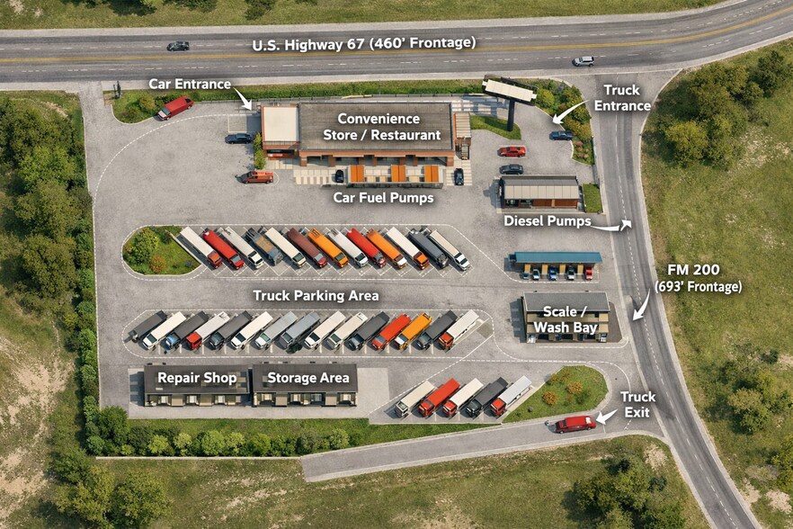 Development site on hard corner of HWY 67, high traffic and high visibility. The site is very level and offers the buyer options for several uses. Plus a portion of the lot has been stabilized and fenced in the past making it great for storage