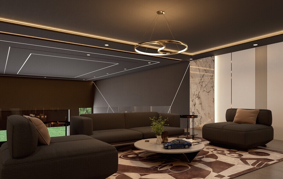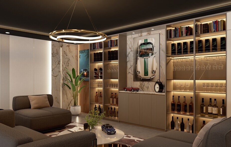 with coffee bar, kitchen/bar, entertaining space & restrooms