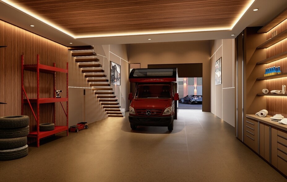25x50’ garage with a 25x16’ mezzanine- 1,650 total sq ft. Mezzanine can hold up to 50,000 lb live load. 14’ hurricane & wind rated roll-up door. 24’ ceilings capable of fitting multiple car lifts.
