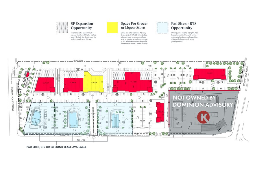 - Excellent visibility increases brand awareness, with roughly 950 feet of frontage on FM 725, and a combined traffic count of 33,533 vehicles daily.