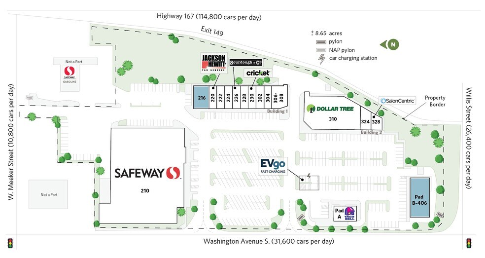 Space 216 is a ±2,200 SF in-line retail space at Langston Landing, a grocery-anchored shopping center featuring Safeway and positioned immediately off Highway 167 in a dense Kent submarket