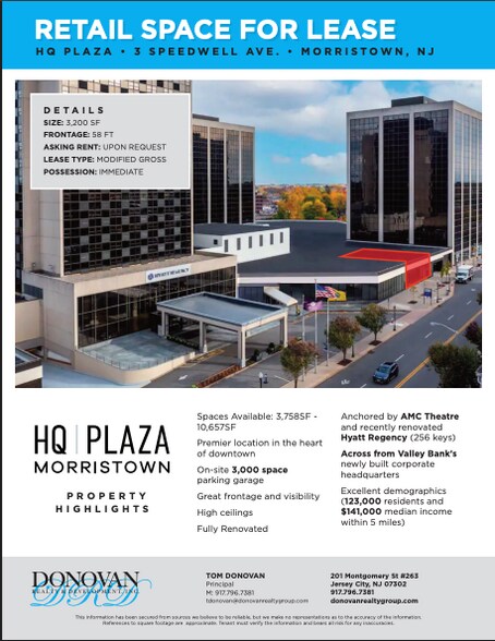 5 spaces total can be divided. Perfect setting for a business in the heart of Morristown! Located at the bustling intersection of Speedwell Avenue, this retail space offers unmatched visibility and accessibility in one of New Jersey’s most vibrant communities. See Article regarding HQ Plaza's Newest High Profile Tenant: https://njbiz.com/kpmg-moving-nj-office-from-short-hills/