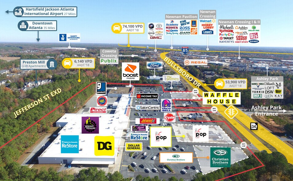 - Situé le long du principal corridor commercial de Newnan, entouré de grandes marques nationales et de générateurs de trafic quotidien.