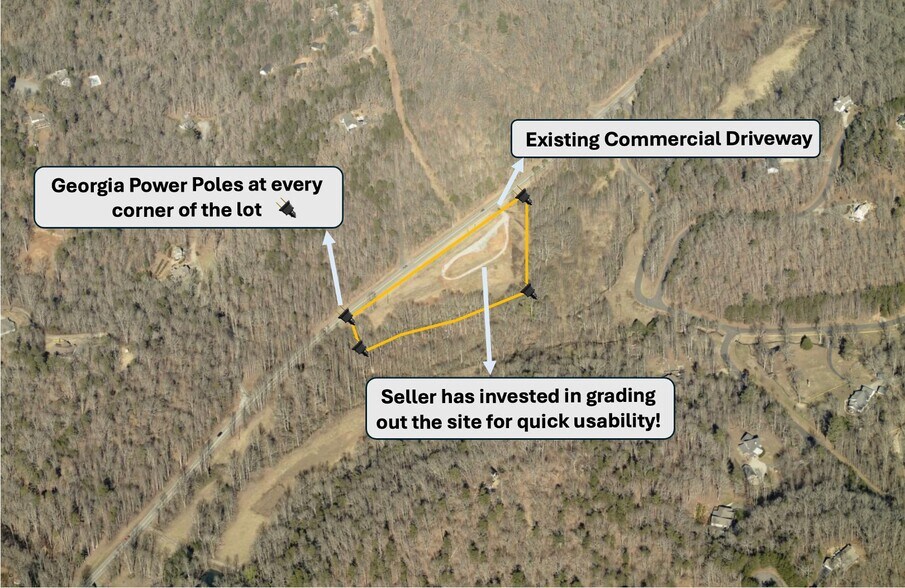 This is the flattest piece of land you will find in all of Lumpkin County! This property is absolutely perfect for someone that needs a quick, centralized location for their business. Commercially zoned. 2.3 miles north of the HWY 400/60 intersection where the brand new Publix and Tractor Supply just opened. 755ft of State Route road frontage! 8,900 vehicles per day pass this location. The property already has a commercial driveway entrance (that's a $100,000 value ALONE) and has been graded with a fence around the entire perimeter. GA Power poles are at every corner of the property. NO state waters on the property that interrupt the flow of building and present frustrating buffers/unusable space. Lumpkin County operates on "land use" zoning, rather than traditional zoning. This means you can do almost anything here by right - no dealing with the politics of how a vote will go, stressing about "extra conditions" randomly thrown at you, or public hearings. If you don't need a building, you can literally start your business day 1, or if you need a building, all you have to do is have your building plans drawn and start building. Water would be accessed by drilling a well, sewage would be a septic tank, which is no different than most developments in Lumpkin County. *This land is also for rent for $2,000 per mo