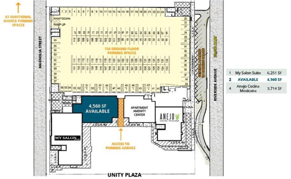 • Espace commercial de 6 212 pieds carrés (divisible) au rez-de-chaussée d'un complexe d'appartements de 5 étages ou 294 unités • Forte population diurne provenant des quartiers d'affaires voisins (43 420 personnes dans un rayon de 1 mile) • Situé sur Riverside Avenue avec 29 000 VPD • Garage de stationnement attenant de 411 places et 101 places de parking partagées supplémentaires avec propriété adjacente • Unity Plaza et la gare de Brooklyn à proximité et à quelques pas des sites historiques de Riverside, Avondale et Five Points