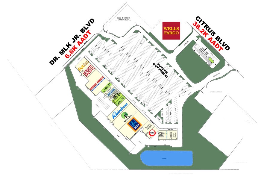 - Centre récemment rénové ancré par Aldi, Dollar Tree, Harbor Freight Tool, Hibbett Sports et Rainbow.