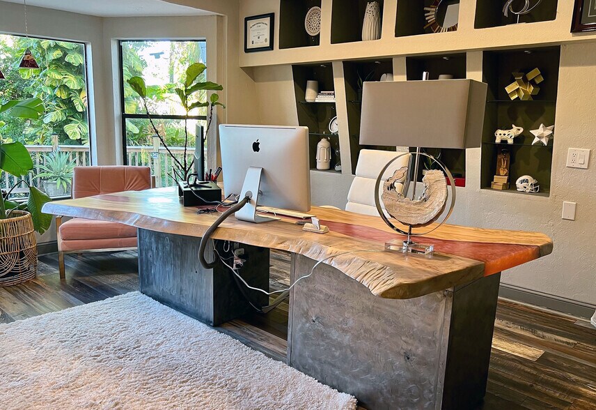 Belcher Bluffs offers a two-building Class A office and studio campus with premium interiors, executive suites, and scenic pond views. The main building features modern reception areas, glass conference rooms, and flexible co-working and private office spaces. A separate studio building includes a chef-grade kitchen, video and podcast production areas, and an upper-level live-work layout. The location provides quick access to major Clearwater corridors, airports, and surrounding business and medical hubs.