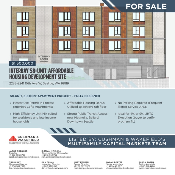 Cushman & Wakefield is pleased to present 2235-2241 15th Ave W, a rare, development site in Seattle’s Interbay neighborhood with a master use permit in process for a 6-story, 58-unit affordable apartment building. The project is ideally positioned for non-profit and mission based housing developers seeking scale in a high-opportunity, transit-served location with no parking requirement and strong alignment with LIHTC, MHA-R performance, and public funding sources. The site is zoned C1-55 (M) and benefits from bonus residential floor area for affordable housing, allowing for a sixth floor and maximizing unit yield. The approved design emphasizes efficient unit layouts, strong net-to-gross ratios, and bicycle-oriented urban living, making it well-suited for long-term affordability and operational efficiency.