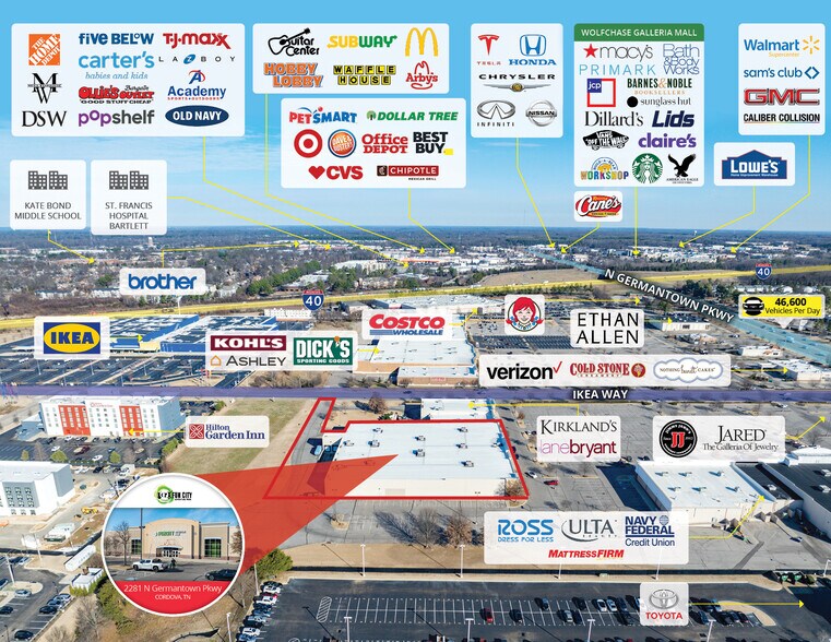 The property is positioned within the largest and busiest retail corridor in Memphis, with Wolfchase Galleria Mall being only 1 mile away. Several other surrounding retail centers include The Commons at Dexter Lake, Memphis Commons, and The Market at Wolfcreek. Other nearby retailers include Costco, Home Depot, Lowe’s Home Improvement, Target, Walmart Supercenter, Sam’s Club, Academy Sports, Hobby Lobby, McDonald’s, Chick-fil-A, Raising Cane’s, and Chipotle, to name a few.
