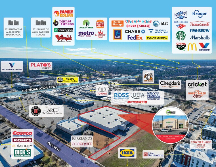 The 60,743 SF building on 2.17 acres anchors Countrywood Crossing, is located on the hard corner signalized intersection of Germantown Parkway (46,600 VPD) and Ikea Way, and is less than half a mile from Interstate 40 (106,400 VPD). The property sits adjacent to one of only two Costco’s in all of Memphis MSA. The property is priced at below replacement cost and offers the Buyer long term upside potential with below market rent at $8 PSF.