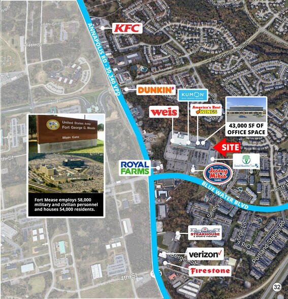 Rejoignez Weis Markets, Columbia Bank, Jersey Mike's, Bruster's Ice Cream et plus encore ! Situé à un pâté de maisons de FORT MEADE au 175 et de Blue Water Boulevard, Odenton, MD.