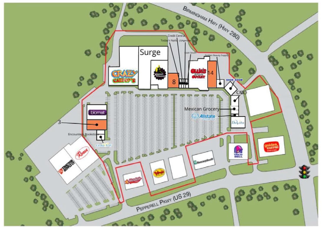 | Biens du centre | 7 | Rues transversales | NWC Pepperell Pkwy (US Hwy 29) & Hw |