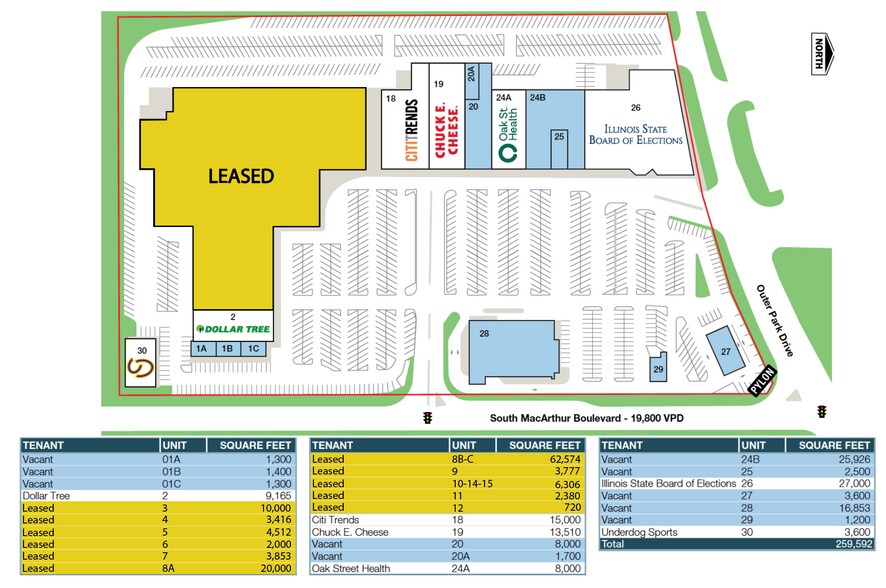 Discover exceptional leasing opportunities at this prominent 259,592-square-foot community retail center located at 2301-2401 South MacArthur Boulevard in Springfield, Illinois. With approximately 1,358 feet of frontage along the heavily traveled MacArthur Boulevard corridor and more than 1,180 parking spaces, the center offers strong visibility, convenient access, and excellent traffic exposure within one of Springfield’s key commercial hubs. Strategically located along South MacArthur Boulevard, the center benefits from strong daily traffic counts of approximately 19,800 vehicles per day (VPD), complemented by an additional 2,500 VPD along Outer Park Drive. Multiple ingress and egress points provide ease of access, while flexible unit sizes ranging from 1,200 to 63,779 square feet support a wide range of tenancy within a proven multi-tenant environment. Currently featuring multiple vacant spaces, the center is undergoing a comprehensive façade transformation and site enhancement program as part of a broader revitalization effort. Under new ownership, approximately $5 million in planned capital improvements will modernize the property, enhance curb appeal, and elevate the overall tenant and customer experience, with completion targeted for Q3 2026. Upon completion, the revitalization is expected to reposition the center as a contemporary, tenant-friendly destination suitable for a wide range of uses, including retail, service-oriented businesses, fitness, medical, office/flex, and showroom concepts. Don’t miss this opportunity to secure a space in a highly visible, well-located center undergoing revitalization.