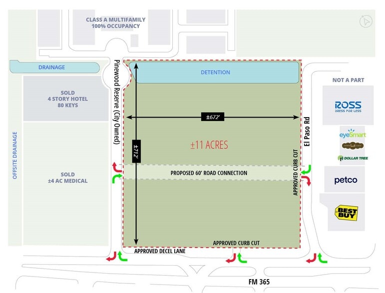 ± 11 acres avec services publics et drainage approuvé à vendre • Utilitaires liés au site • Détention et drainage approuvés • Nouvelles bordures de trottoir et nouvelle voie de décélération approuvées par TxDot • Façade de ±700 pieds le long du FM 365 • Zone commerciale