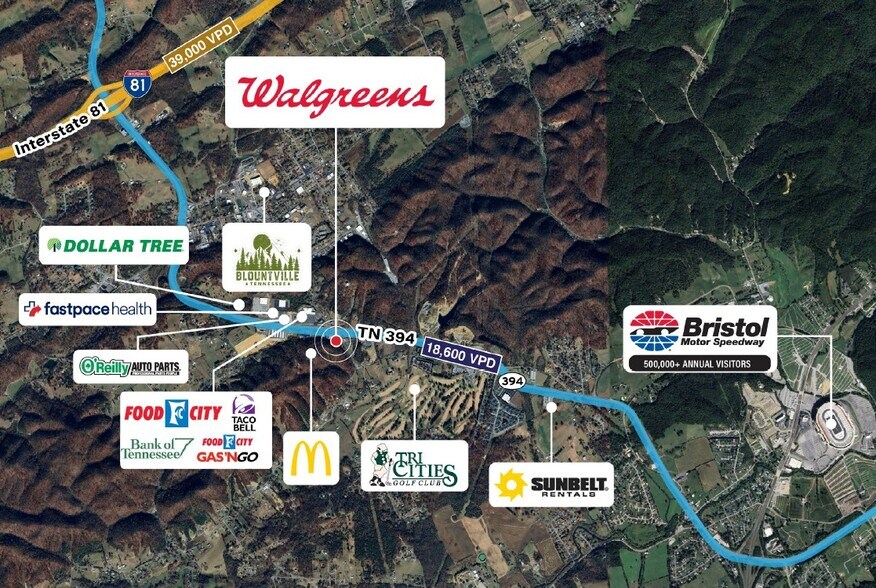 - Located along Tennessee Highway 394 (18,600 VPD) & minutes from Interstate 81 (39,000 VPD)