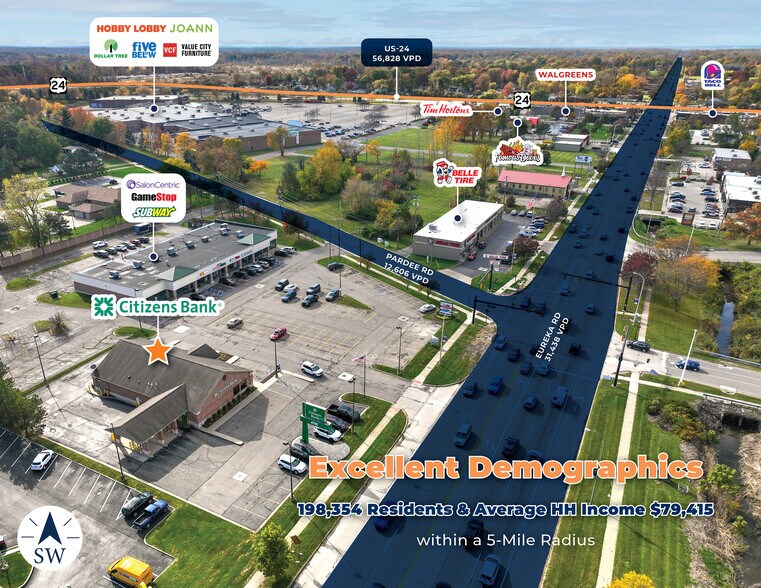 The bank benefits from high visibility and convenient access off Eureka Road (31,438 VPD), near Telegraph/US-24 (56,828 VPD), and Interstate-75 (92,952 VPD). The property is shadow-anchored by major retailers including Dick’s Sporting Goods, PetSmart, Airborne Adventure Park, and Party City.