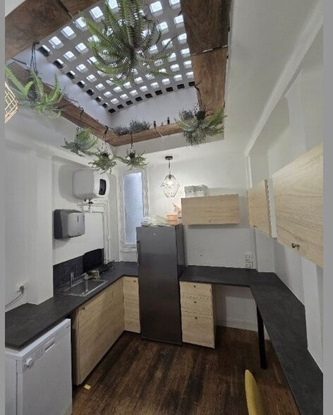 - Locaux organisés en espace ouvert, bureaux, cuisine et sanitaire.