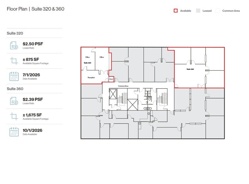 | 3e étage, bureau 360 | 156 m² | 2-5 Ans | 266,38 € /m²/an 22,20 € /m²/mois 41 451 € /an 3 454 € /mois | Bureau | - | 01/10/2026 |