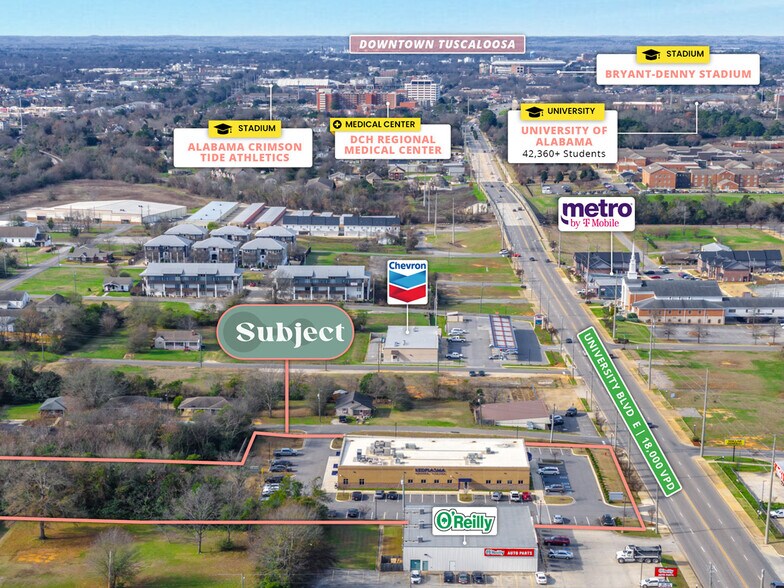 - Adjacent to University of Alabama - Prime Frontage Along Tuscaloosa’s Dominant Retail Corridor, Surrounded by UofA Medical Center and Student Housing