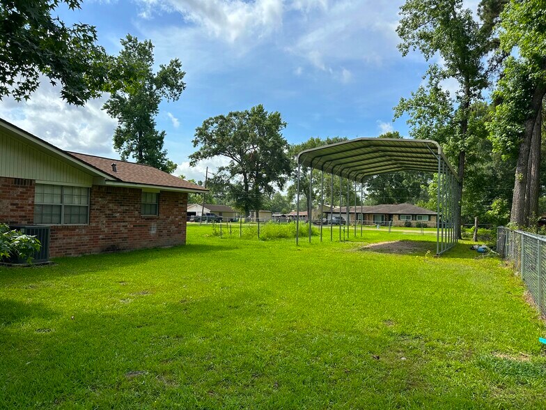 Nestled a few minutes from Kingwood, this property on 2/3 Acres presents a unique opportunity for residential or commercial use. Unrestricted with No HOA. Main road project to be widened to 4 lanes. Featuring a spacious 600 sq ft living area open to a large island kitchen, recent upgrades include a new roof, paint, and porcelain wood tile flooring. With a covered RV parking area and separate utility connections, this home boasts 3 bedrooms, 2 baths, formal living and dining rooms, a covered patio, 2-car garage, and a carport. x