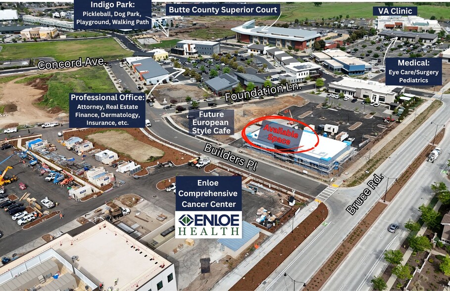 Brand new ±4,004 SF Class A office suite at 2476 Builders Place, Suite 110, delivering June/July 2026. The space is part of a new 8,000 SF one-story building currently under construction, located next to Mid Valley Title and just steps from the new Enloe Cancer Center, set to open this year. Tenants can begin custom tenant improvements now, allowing the interior to be tailored to specific needs ahead of delivery. A healthy café with outdoor patio seating is planned immediately adjacent to the building, adding daily convenience for staff and clients. Situated in the heart of Meriam Park, the space offers a truly walkable environment with coffee, shops, fitness, beauty services, live events, parks, and more all within easy walking distance.