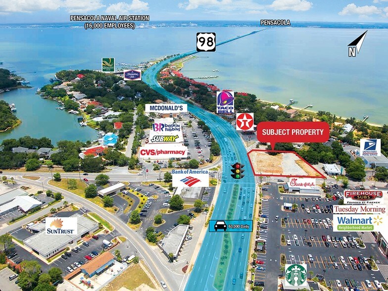 End-Cap unit with Drive-Thru Hard corner location as the first signalized intersection off the Pensacola Bay Bridge, the Primary Access Route to and from Pensacola and Pensacola Beach. Surrounded by Hotels, Elementary, Middle, and High Schools Minutes from Pensacola Beach with approximately 9 million Tourists Annually.