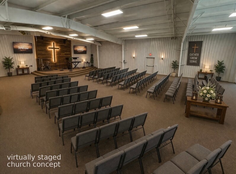 Positioned for versatility and long-term value, this 11,462 sq ft steel building, built in 2011, presents a standout opportunity for investors and owner-users alike. The expansive main area offers seating capacity for up to 440—ideal for a church, event venue, or large-scale gatherings—while a dedicated basketball gymnasium, open-concept space, and multiple private rooms provide flexibility for offices, classrooms, or income-producing suites. An additional 1,387 sq ft upper level enhances functionality for offices, storage, or viewing. Fully heated and cooled for year-round comfort, the property features 18 ft ceilings, 50 paved and lighted parking spaces, and 368 ft of road frontage on .74 acres, zoned C-2 with city utilities, and conveniently located near I-70 and US 41.