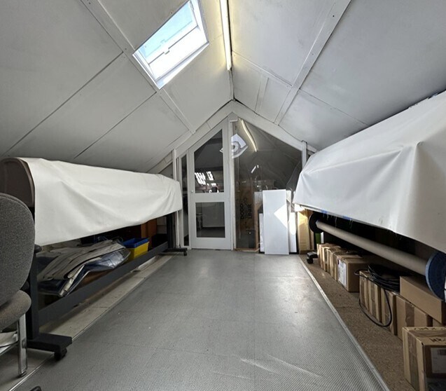 Detached workshop accessed via a cobbled lane comprising ground floor workshop with pedestrian and manual folding goods door (3.50m wide x 2.56m high). The workshop enjoys 3 phase electricity and LED lights throughout. Staff WC is set under the stairs providing welfare. Principal stairs lead to a first floor office with south facing windows and comprehensively fitted with storage, desk etc. The office leads to a mezzanine set under dual pitched and hipped corrugated roof, which has restricted height but provides ample storage to eaves. Rear stairs lead down to rear workshop.