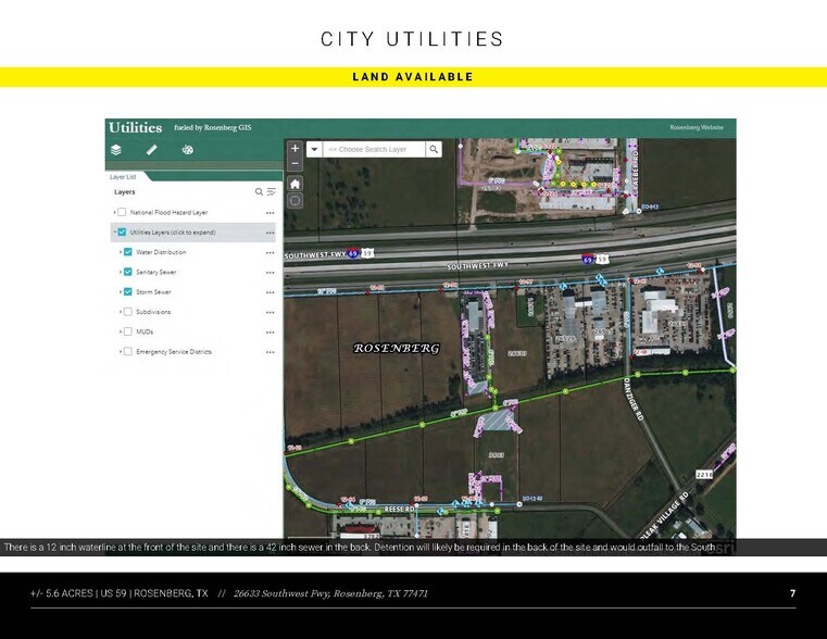 This prime ±5.44-acre tract offers exceptional frontage along US 59/Southwest Freeway in Rosenberg, TX, a high-growth corridor within Fort Bend County. The site boasts outstanding visibility to heavy traffic flows and convenient access via feeder roads, making it ideal for retail, hospitality, or mixed-use development. Located adjacent to major automotive dealerships and minutes from Brazos Town Center, the property benefits from strong co-tenancy and a thriving commercial environment. With utilities available on-site and robust regional demographics, this parcel presents a rare opportunity for developers seeking a strategic position in one of Texas’ fastest-growing markets.
