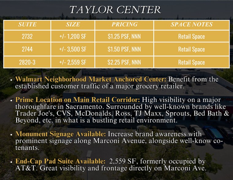 Taylor Shopping Center 2700-2826 Marconi Ave Espace disponible | 111–674 m² | Local commercial | Sacramento, CA 95821