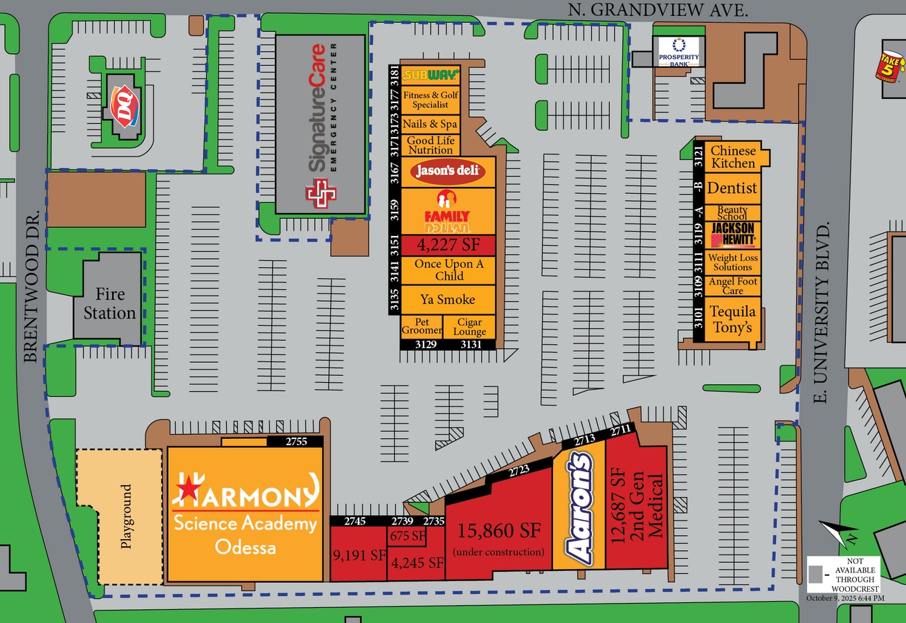 Town & Country Shopping est un centre commercial d'environ 148 000 pieds carrés situé à l'angle nord-ouest de l'université et de Grandview à Odessa, au Texas. Town & Country est animé par Aaron's, Payne's Gym, Jason's Deli, Family Dollar et des spécialistes du golf et du fitness. Les suites commerciales de ce centre sont disponibles à la location pour tout, des vitrines traditionnelles aux restaurants, en passant par les bureaux et les prestataires de services médicaux ou autres prestataires de services professionnels. La suite 2711 est un terminal de cabinet médical de deuxième génération d'une superficie de 12 687 pieds carrés disponibles. Cette zone hautement générative est idéale pour toute entreprise et ne cesse de croître, car le solide taux de croissance démographique de 2,2 % enregistré entre 2010 et 2022 dans un rayon de huit kilomètres devrait atteindre 3 % d'ici 2027. L'un des principaux points d'ancrage économique d'Odessa est le bassin permien de l'université du Texas, à environ 1,5 km de Town & Country. Le collège d'Odessa est à trois kilomètres, avec un nombre d'inscriptions combiné de plus de 11 000 étudiants. Woodcrest Capital accueille les nouvelles entreprises et les entreprises franchisées dans ses centres avec des baux faciles à lire et des conditions flexibles, tout en étant suffisamment sophistiqués pour satisfaire les plus grands locataires du crédit national. Entreprise familiale spécialisée dans l'immobilier commercial depuis plus de 40 ans, Woodcrest possède et exploite tout, des centres de classe A situés dans les quartiers les plus fréquentés aux centres en difficulté qu'elle réhabilite dans des communautés rurales en difficulté. Appelez-nous dès aujourd'hui pour trouver le bon emplacement pour votre entreprise, car nous avons généralement plusieurs opportunités de vente au détail dans les environs immédiats !